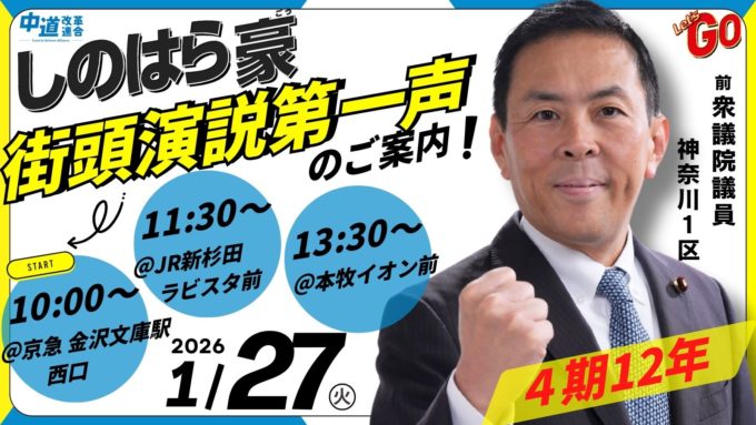 1/28(水) 桜木町合同演説会のお知らせ〜来たる野田代表、西田幹事長